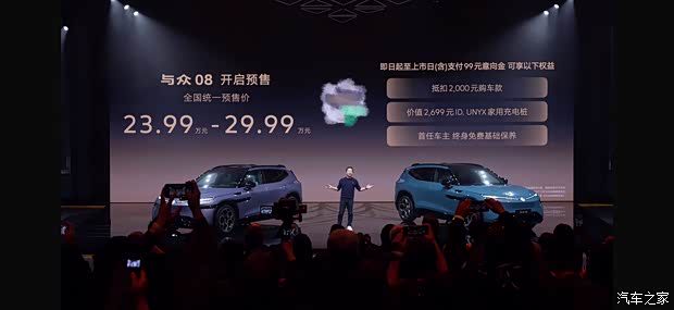 首批用户三重权益:支付99元意向金抵扣2000元购车款、送价值2699元ID. UNYX家用充电桩、首任车主终身免费基础保养。