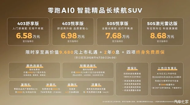 零跑A10主要竞争对手包括吉利星愿和比亚迪元UP,前者虽然定位为小型车,但它是目前市场中最为火热的产品,月均销量将近4万台,相信这也是零跑A10所期待能够达到的数据。比亚迪元UP虽然目前在智能化和续航方面并不占优,不过从此前工信部曝光了新款元UP申报图,其将提供车顶雷达的选装并会对动力系统进行升级,届时零跑A10还能否保持优势值得关注。编辑点评:零跑汽车作为2025年最为风光的新势力车企之一,其在2026年也会继续大步向前,进一步丰富产品阵容。零跑A10是零跑汽车在2026年推出的首款车型,它自然也肩负着销量表现的重担。从目前来看,它确实展现出了小型SUV市场中标杆级的产品力,同时依旧保持着高性价比的优势,就看它的竞争对手能否在今年年内推出新款缩小差距,甚至实现超越了。