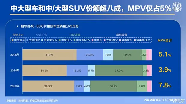 50万预算的用户都买了啥?50万级汽车市场格局究竟如何?根据40–60万价格段车型终端销量数据显示,截至2025年,中大型车占据了41.8%的市场份额,较前两年进一步扩张,主要贡献来自豪华品牌燃油车型。在高端市场,豪华品牌依然具备强劲的品牌优势。其次是大型SUV,占比达到20.6%,相较 2023年规模翻了2.6倍。中大型SUV占比虽不足8%,但同比同样实现明显增长。这主要得益于消费升级与置换需求提升,原本中型SUV市场大幅萎缩,用户持续向上升级。同样受到挤压的还有中大型MPV市场,其份额较 2023 年缩水过半。随着空间更大、舒适性不断提升的六 / 七座SUV兴起,传统中大型MPV的产品优势被大幅削弱,用户明显流失。从整体 MPV 市场来看,2025 年其细分市场占有率仅为 5.1%,虽仍未恢复至 2023 年水平,但已实现同比回升。这主要得益于新能源产品的持续投放,中大型MPV市场得以止跌回升,大型MPV市场也实现小幅扩张。