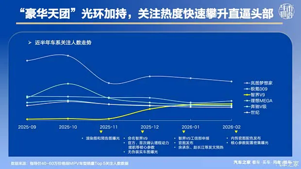 华为奇瑞“豪华天团”造势加持,关注度一路走高 智界V9尚未上市便已备受市场关注。据汽车之家大数据显示,2025年11月新车信息刚一释放,关注度便开始走高;随着12月更多信息曝光,关注度进一步快速攀升。截至2026年2月,在仅公布官图与配置、实车尚未正式亮相的情况下,智界V9的关注人数已超越理想MEGA、奔驰V级、世纪等车型,跻身榜单前三。预计3月实车亮相、4月正式到店后,其市场关注度还将迎来新一轮上涨。为何一款全新车系会引发用户围观?不仅仅是因为它是一款旗舰车型,更是得益于前期的造势。智界V9的背后,是一个拥有“华为技术+奇瑞制造+荣耀品牌”三重基因的汽车品牌。在余承东、尹同跃坐镇下,智界构建了一支堪称“豪华天团”的跨界作战部队。2025年底,前荣耀CMO、华为终端营销老将郭锐确定加盟智界汽车,将出任CEO。2026年2月,前比亚迪腾势品牌掌舵人赵长江在微博官宣加入鸿蒙智行旗下智界汽车,出任执行董事及执行副总裁。强强联合,将消费电子领域的用户运营、品牌操盘、全球化经验注入汽车行业,推动行业竞争从“硬件内卷”转向“用户心智争夺”。此外,拥有“媒体+车企+互联网”多重经验的范鑫的加入,也将为智界实现内容营销破圈,建立品牌差异化标签。不过,高关注度并不等同于高销量转化,最终仍需市场检验。