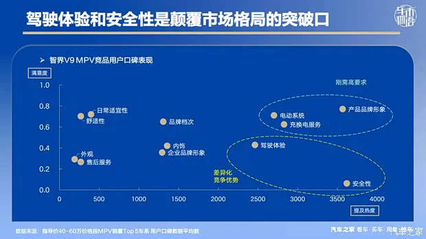 打破格局的突破口在哪里?那些头部高端MPV,究竟凭借什么俘获消费者?而想要超越它们,突破口又在哪里?据汽车之家口碑数据显示,在指导价40-60万销量Top 5的MPV车型中,用户对各维度的平均满意度评价均为正值,这意味着,这些头部车型几乎没有明显短板。结合满意度高低与提及热度来看,智界 V9若想突出重围,首先要确保用户刚需的电动系统、充换电服务以及产品品牌形象均处于优质水平;同时,针对当前市场产品普遍相对薄弱、但热度很高的驾驶体验和安全性重点发力,是实现差异化竞争、突围而出的关键所在。