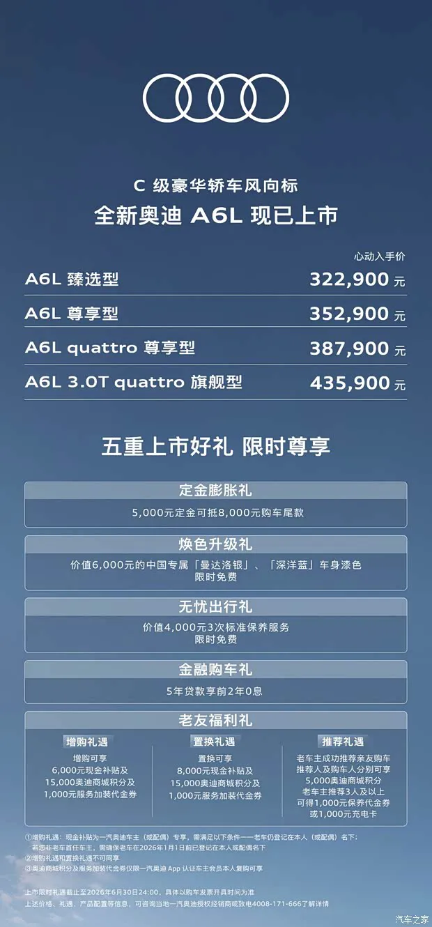 全新奥迪A6L 官方售价 车型 官方售价(万元) 臻选型 32.29 尊享型 35.29 quattro 尊享型 38.79 3.0T quattro 旗舰型 43.59