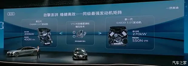 同时,在动力层面,PPC平台可实现搭载HDI双电机全域智混技术,未来还会兼容PHEV。全新奥迪A6L提供三套动力总成,涵盖2.0T高低功率及3.0T V6发动机,最大功率分别为150kW、200kW和270kW,最大扭矩分别为340N·m、400N·m和550N·m。其中2.0T低功率发动机采用改良版米勒循环技术,搭载的可变截面涡轮增压器(VTG),可降低低速工况下的涡轮迟滞,让油门响应更灵敏,0-100km/h加速8秒。2.0T高功率发动机基于第五代EA888发动机打造,匹配48V轻混系统,实现12.5:1的高压缩比,热效率高达39.4%,四驱车型0-100km/h加速5.8秒,两驱车型0-100km/h加速7.2秒。3.0T V6发动机同样配备VTG可变截面涡轮增压器、间接式中冷及米勒循环技术,并搭载48V HDI双电机全域智混系统,0-100km/h加速4.6秒。