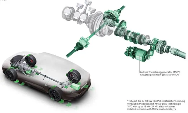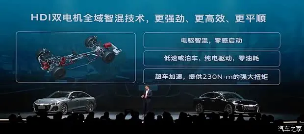 HDI双电机全域智混技术采用P0+P3的并联式混动架构,其中P0电机负责启动发动机并为电池供电,P3电机集成在变速箱输出轴且能参与直驱,可提供高达18kW的动力输出,峰值扭矩达230N·m。P3电机在0-140km/h的广域范围下都能介入,在低速起步跟车时,它会采用纯电驱动模式。在急加速或是全油门超车时,能让动力释放更直接。滑行减速过程中,P3电机可进行动能回收为电池充电,最大能量回收功率25kW,该系统配备了1.7度磷酸铁锂电池。