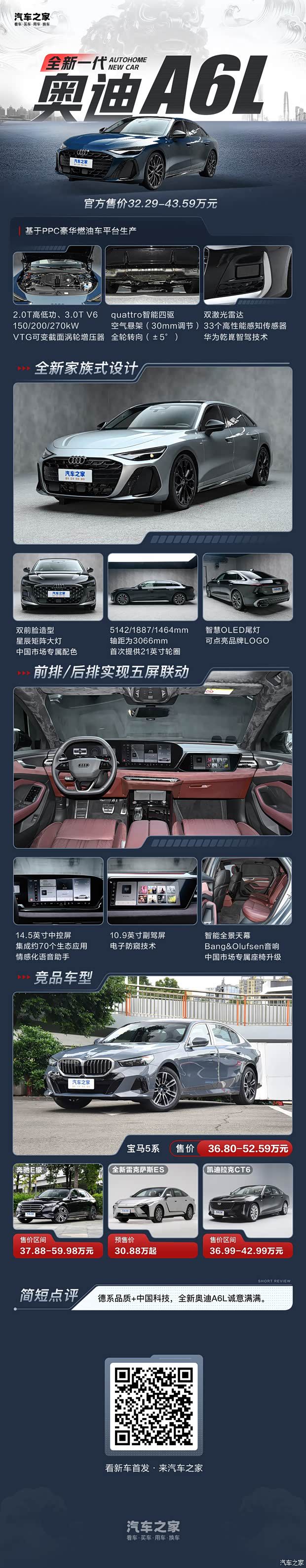 奔驰E级与宝马5系目前终端都有超10万元的优惠,竞争激烈。奔驰E级也针对中国市场进行了本土化适配,比如搭载高通8295旗舰座舱芯片,为中国消费者带来10项专属豪华舒适增配,涵盖后排座椅座垫加长、头枕加热、电动可调后排腿托以及后排环绕式氛围灯等实用功能。同时在高速及城市快速路场景下实现自动变道、自动超车、自动远离大型车辆以及自动驶入驶离匝道等丰富功能。● 编辑点评:基于全新PPC平台打造的全新奥迪A6L,在设计、豪华、驾控、智能和品质维度实现升级。新车将具备双外观设计、数字矩阵大灯、内饰多屏联动、豪华舒适空间、智能语音助手、三种发动机矩阵、HDI双电机全域智混技术、自适应空气悬架、全轮转向系统、华为辅助驾驶等十大亮点。凭借全面革新的产品力,再辅以更具吸引力的定价策略,全新奥迪A6L未来持续领跑豪华中大型车市场并非难事。