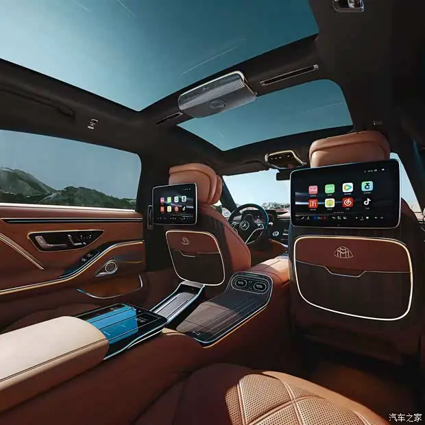新款迈巴赫S级搭载奔驰自研的MB.OS架构,贯通辅助驾驶、智能座舱与性能表现三大功能域。前排采用一体化玻璃面板设计,将14.4英寸中央显示屏与12.3英寸前排乘客显示屏融合。12.3英寸数字仪表盘采用迈巴赫专属设计,搭配可选装的3D显示功能。后排娱乐系统搭载双13.1英寸高清显示屏,全新可拆卸式独立触控遥控器可轻松操控空调、遮阳帘及后排娱乐系统等功能。集成摄像头支持视频通话功能。