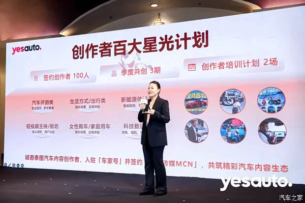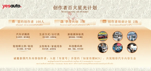 具体怎么做?对泰国用户,我们会做三件事:第一,发起一季一事超级出品人计划,跟当地达人一起策划汽车事件型栏目,让用户看得尽兴,也看到硬核真实的车辆表现;第二,常态化做一周一车专业评测,挑TOP20主流车型每周一款,让用户慢慢看、仔细选;第三,在Yes Auto网站上,从车型图库到功能视频,从参数对比到横评测试,从看车选车到比价决策,一站配齐。我们的目标就一个:让每位用户都能全面掌握信息,轻松做出选择。对泰国创作者,我们一直相信,每一个热爱汽车的声音都值得被听见。所以我们想跟大家深度共创,共享三样东西:流量池,把你的声音推给更多人;资源池,车展、探厂、优先试驾,这些过去只有大媒体才能拿到的资源,我们愿意共享;商业池,品牌合作、内容定制,让创作也能有实实在在的回报。今天我宣布YESAUTO首批创作者“百大星光计划”正式发起招募:我们在2026年计划签约100位泰国新锐创作者,组织3期季度内容共创,举办2场创作者培训。我们在找什么样的人?汽车测评、生活方式、科技数码、短视频主持、女性购车、新能源体验——只要你热爱车,热爱分享,我们都欢迎。我们诚挚邀请泰国创作者加入车家号创作者生态,签约知家传媒MCN。这不仅是一个平台,更是一个属于汽车内容创作者的大家庭。下个月北京车展即将开幕。我们诚挚邀请泰国自媒体朋友来北京,一起看车、聊车、拍车。让我们在曼谷相遇,也在北京重逢。让每一个热爱汽车的声音,被世界听见。