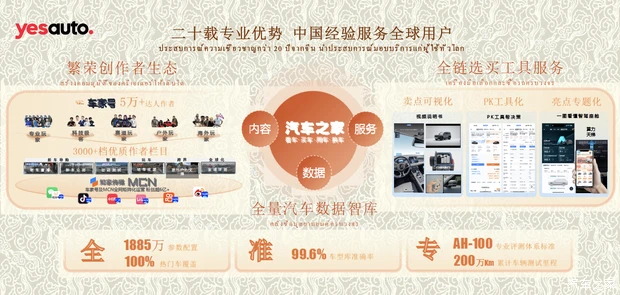 为什么首站选泰国?首站选泰国,不是偶然。首先,泰国汽车产业正处在深度重构的关键节点,市场在涨,选择变多,消费者需要有人帮他们看清、看全、选对。其次,泰国产业基础扎实,不仅是东盟地区最大的汽车生产国,更是面向整个东南亚的核心汽车出口基地,为中国汽车产业出海提供了至关重要的战略支点。另外,这里有年轻、活跃的内容土壤,互联网渗透率高,大家都爱分享。所以我们来了,想让内容在这里生根,让服务在这里落地。我们之前走访市场,跟泰国消费者聊,发现大家其实不缺选择,缺的是省心的选择。日系口碑稳,中国车技术新,欧洲车品牌好,怎么选?85%的人愿意参考达人推荐,但信息都散落在各处——YouTube看评测,Facebook问朋友,TikTok看体验,网站查参数。我们想做的,就是把分散的信息收拢到一起,把专业的评测做透,把真实的口碑聚拢,把选买的工具配齐。从内容到信息,从分享到决策,让用户在一个平台上就能完成全过程。我们在中国走了二十年,建了中国顶级的汽车创作者生态,车家号有5万多创作者,年产十几万条专业内容,覆盖6亿粉丝。我们有各种工具帮用户决策,把复杂的车型配置一眼看懂。还有全量的汽车数据智库,车型库准确率99.6%,专业评测里程超过200万公里。这些能力,我们不想简单复制,而是做本土化适配,让泰国用户也能享受到同样专业、省心的服务。
