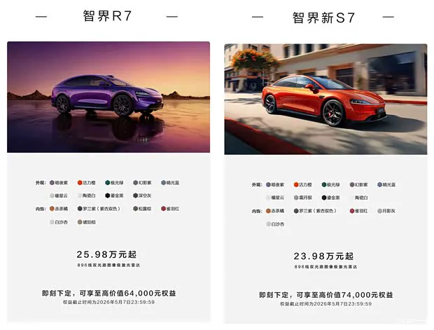作为了解,两款新车已于此前完成上市,其中新款智界S7售23.98万起;新款智界R7售25.98万起。具体来看,新款智界S7与现款车型保持一致,All-in-One整合设计,有着不错的辨识度。同时,新车推出全新活力橙和暗夜紫配色。尺寸方面,新车长宽高分别为4971/1963/1474mm,轴距为2950mm。