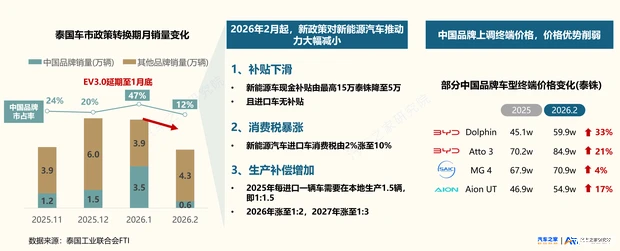 生态深耕:渠道与服务网络完善,构建用户体验护城河中国车企正以渠道、服务、补能三位一体的体系化布局,构建本地化用户体验的核心护城河,实现从“造车卖车”到“全生命周期服务”的战略升级。渠道端以网点数量与质量双提升实现服务触达无死角;服务端MG、长城等品牌推出差异化保障体系,有效消解用户售后焦虑;补能端则通过“自建+合作”模式,既保障核心区域覆盖,又快速补齐网络短板,缓解用户里程焦虑。三、中国品牌在泰未来:“品牌&技术&生态"三位一体的价值战政策红利收窄,中国品牌渗透阻力增加2026年1月,泰国车市销量7.4万,增速54%。中系市占率首超日系,达到历史性高点47.3%。这一爆发式增长,既是EV3.0政策的窗口期产物(补贴1月截止,集中交车),也是中国品牌多年在泰深耕的阶段性成果。然而,2月随着新能源汽车补贴退坡和进口车消费税从2%回调至10%,中国品牌市占率从47.3%骤降至11.6%。这一剧烈波动清晰地表明:中国车企产品力已获市场验证,但补贴推动的消费不可持续。政策变化迫使中国车企上调终端价格,2026年中国车企进一步渗透的阻力增加。