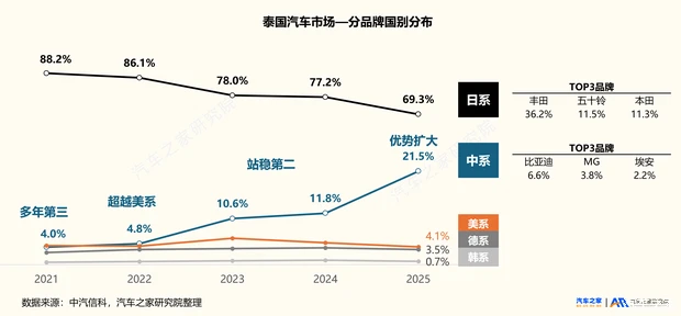 格局重构:日系份额持续松动,中系品牌加速渗透自1962年日产在泰国建立第一家汽车组装厂算起,日系车企已在泰国深耕超过60年,构筑起了坚实的市场堡垒——2022年前日系品牌在泰国市场的市占率长期稳定在85%左右。然而,这一统治格局在电动化浪潮与中国品牌的猛烈攻势下正加速松动。2023年日系市占率首次跌破八成,降至78.0%,2025年进一步降低至69.3%。丰田、五十铃、本田虽仍稳居榜单TOP3,但份额相比2024年下滑5个百分点,日系“坚实堡垒”的裂缝正加速扩大。与日系持续下滑形成鲜明对比的是,中系品牌在五年间赶美追日强势崛起,市场份额从2021年的4.0%增长到2025年的21.5%,强势跃居第二。凭借对政策窗口的精准把握、电动化的先发优势、全产业链的协同出海以及新能源产品的价格和智能化优势,中国品牌在泰新能源领域占据绝对主导地位,中国品牌新能源汽车已成为泰国消费者首选。