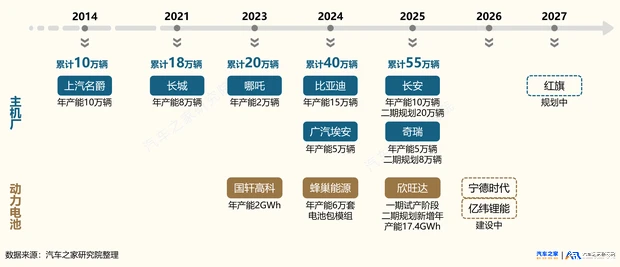 在产品层面,中国品牌在泰国形成“主流保规模、高端树品牌”的产品布局:主流市场:比亚迪 Dolphin、比亚迪ATTO 3、MG 4 等车型凭借高性价比成为走量主力高端市场:极氪009(参数|询价)、腾势D9、小鹏X9 等车型入场,推动中国品牌内部30万以上车型份额从2024年4.1%跃升至2025年11.3%这种协同布局既夯实了市场份额,又实现品牌价值向上突破,为深耕东南亚奠定核心竞争力。产能迸发:政策倒逼下的全链落地竞速,规划年产能突破55万上汽是最早布局泰国的中国车企,2014 年便与正大集团合资建厂。2020年,长城汽车收购通用罗勇府工厂,以轻资产模式快速进入。2022年泰国推出EV3.0政策,以“本地生产与进口1:1配比” 绑定税收减免与补贴,强力推动中国车企在泰建厂。比亚迪、广汽、长安、奇瑞等密集落地,从建厂到投产平均仅15个月,广汽埃安更是仅用了9个月。截至2025年,中国车企在泰规划年产能达55万辆,较2021年增长两倍。供应链方面,泰国EV3.0、EV3.5政策要求零部件本地化率不低于40%,电池管控更严格:2026年6月前进口电池成本占比不超过15%,7月起进一步降至10%,并需提交本土采购计划,否则取消补贴。对此,上汽、比亚迪自建电池包产线,实现电池本土化配套;其他车企则带动核心零部件供应商协同落地。宁德时代、国轩高科、蜂巢能源、欣旺达等电池企业多以合资方式进入泰国,推动当地从整车组装中心升级为东南亚新能源制造基地。