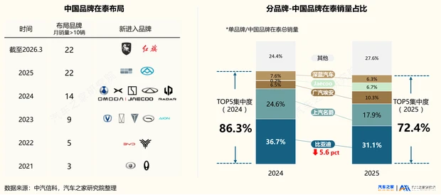 竞争加剧:从“单极爆发”到“多级竞争”,品牌高端化破局2023-2024年中国品牌迎来入泰高峰期,两年间有10多家品牌宣布进入。这一势头在2026年仍未停歇——3月东风汽车与红旗双双官宣进入泰国市场。品牌的加速涌入,直接加剧了中国品牌的内部竞争。2025年,布局较早的比亚迪以31%的份额稳居中国品牌榜首,但在越来越多新玩家的分流下,其市场份额出现下滑。同时,中国品牌TOP5的集中度下滑至72.4%,竞争格局从“单极爆发”逐步走向“多级竞争”。