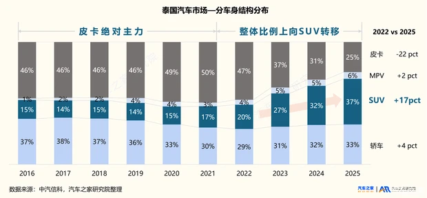 消费变迁:皮卡退潮,份额跌破30%,SUV首次超越轿车成为份额最大车身类型泰国曾被誉为“皮卡王国”,2022年前,皮卡长期占据泰国市场约50%的份额。但这一格局正在发生历史性转折,受家庭债务高企、银行信贷收紧及消费心智迁移等多重因素影响,皮卡市场份额持续萎缩——从2023年37%降至2024年31%,2025年进一步跌破30%关口。与此同时,SUV强势崛起,2025年首次超越轿车,以37%的份额成为泰国市场第一大车身类型。此消彼长间,标志着泰国汽车消费正从“生产力工具”向“家庭生活方式”转型:皮卡逐渐回归载货这一“生产工具”的本源,家庭和城市通勤需求正被更舒适、更智能的SUV承接。