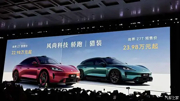 内饰方面,新车拥有仪表盘,大尺寸的悬浮式中控屏和副驾屏,新车首发随动四维屏,支持前后伸缩和左右旋转,可自动转向、智能迎宾,呼叫小艺即可转向应答。副驾屏可以显示更可爱的宠物形象。新车还配备ALPS健康座舱2.0,采用MOFs吸附降解材料,打造更健康的座舱环境。尚界Z7首发搭载水离子空调,可以保湿补水、杀菌抑敏。后备厢最大容积达到1694L。辅助驾驶层面,尚界Z7T将配新一代896线双光路图像级激光雷达,其分辨率提升4倍,远距离可识别14cm高的微小目标。同时,尚界Z7T全系标配华为乾崑智驾ADS 4.1,带来更智能、更舒适、更安全的出行体验。动力方面,尚界Z7T将提供单电机后驱和双电机四驱版本,单电机版最大功率359马力(264千瓦),双电机版最大功率590马力(434千瓦),新车搭载81度和100度的宁德时代三元锂电池,华为巨鲸电池平台,CLTC最大续航905km。● 编辑点评:尚界Z7T采用个性的猎装车设计,迎合了年轻消费者对驾控的需求,也同时满足了远途自驾旅行需求,并让这款车在同价位区间更具个性。这次尚界Z7T也做足了功课,在智能化、驾控方面,迎合年轻用户的需求,并且外观也相当动感,结合华为出色的辅助驾驶能力,将成为这款车型的一张王牌。