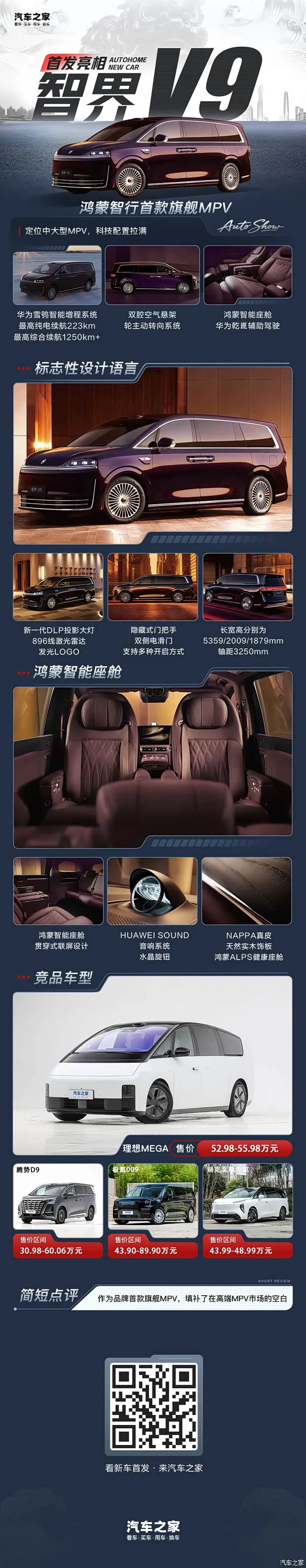 智界V9定位50万级高端MPV,直接对标别克至境世家、极氪009、腾势D9、理想MEGA等热门车型,相比竞品,智界V9在智能化、底盘技术、续航表现上拥有明显优势,产品力更具差异化。对于追求豪华舒适、智能科技、超长续航,同时需要大空间的家庭用户和商务用户来说,智界V9无疑是当下值得选择的新能源MPV之一,正式上市后有望打破高端MPV市场的固有格局,成为鸿蒙智行的又一爆款车型。编辑点评智界V9作为品牌首款旗舰MPV,彻底填补了品牌在高端MPV赛道的空白。新车以华为全栈技术为核心壁垒,同时兼顾家用与商务。智界V9凭借后轮主动转向+双腔空气悬架的底盘操控,以及鸿蒙智能座舱、华为乾崑辅助驾驶等智能化体验拥有核心竞争优势。但作为全新车型与全新序列,智界V9的产品力仍需要市场沉淀,相比别克、腾势等车型,市场认知度以及整体产品力还有有待验证。整体而言,智界V9凭借硬核产品力足以在50万级MPV市场站稳脚跟,让我们也期待新车正式上市后的市场表现吧。