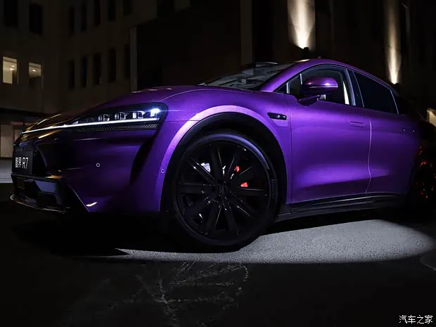 车身侧面,车型尺寸方面,新车长宽高分别为4956/1981/1634mm,轴距为2950mm,风阻系数为0.219,黑化的轮圈+红色卡钳彰显运动感。车辆尾部贯穿式样式,并设计有熏黑运动小扰流板。新款智界R7共计提供11种车漆颜色,包括全新的活力橙和暗夜紫。