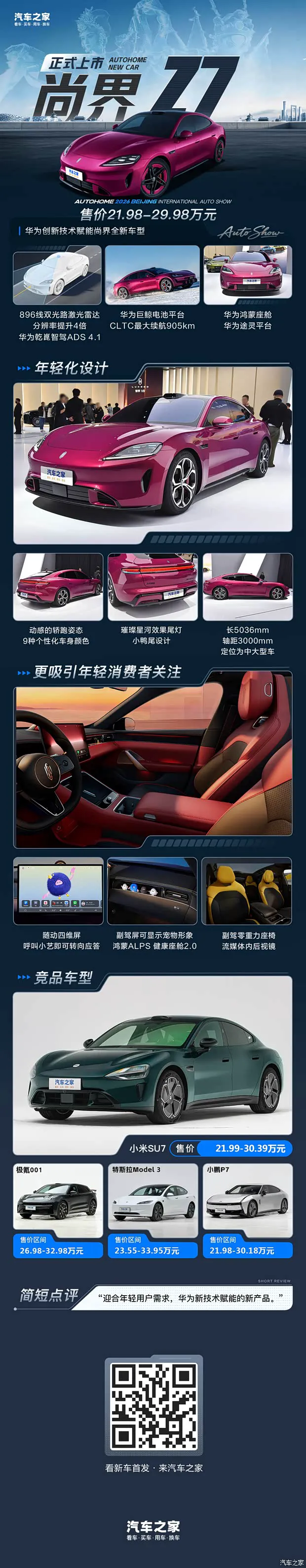 尚界Z7的核心竞品为小米 SU7,后者是20万元级销量热门,凭借驾控、设计、智能及亲民定价占据优势。此外,特斯拉Model 3、小鹏P7、极氪001同为其主要竞品,均主打运动操控与性能。此前鸿蒙智行车型多偏向高端,上汽与华为合作的尚界开辟了新价格带,尚界H5更是让鸿蒙智行首次下探至20万元以内,主攻年轻消费群体。尚界Z7/Z7T在智能化、驾控层面贴合年轻用户需求,外观动感,叠加华为智驾优势,让我们期待其正式上市后的市场表现。