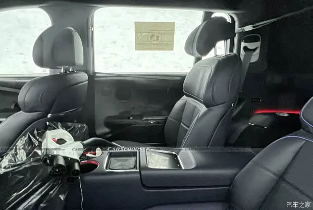 目前谍照显示的车辆中控被完全覆盖,不确定是否会延续概念车设计。不过从另外的细节可以看到,车辆后排座椅十分宽大厚重,采用几何造型分割,有点美式SUV的感觉。座椅中间配备宽厚的中央扶手,并集成杯架、无线充电板以及功能控制屏幕。根据座椅布局来看,预计测试车辆有可能为4座车型。动力上,新车基于“eM”平台打造,是现有E-GMP平台的进化版,或将配备113kWh电池组,续航里程有望超过800km。此外,车辆还将配备空气悬架和后轮转向。关于该车更多消息,我们将持续关注。