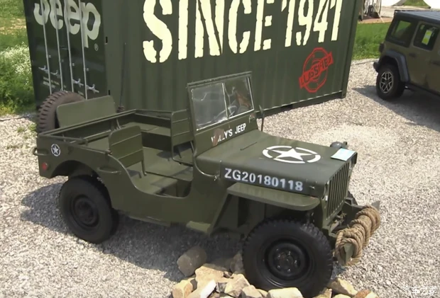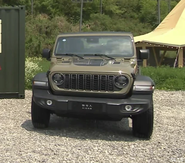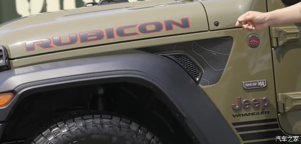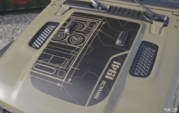 具体来看,新车在外观方面拥有专属的设计元素,车漆采用41号绿色车漆,发动机舱盖拥有熏黑贴纸,展现了1941年威利斯吉普车装箱空投的场景,车头也配备了熏黑的进气中网。其它方面和现款保持一致,配备经典的圆形大灯,越野风格的前包围能够最大程度上增大接近角,提升通过性。