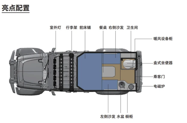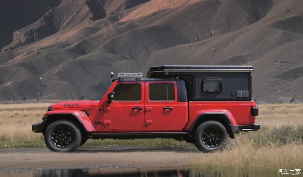 Jeep角斗士旅居版定位皮卡车,官方对其进行了房车化改装,车斗配备可手动升起的房箱,有灰色和白色可选。内部配备床铺、沙发、餐桌、洗漱池、橱柜、电磁炉、柴油暖气、换气扇,甚至还有一个卫生间,可谓是麻雀虽小,五脏俱全。此外新车还可以选装驻车空调、发电机等配置。该车长宽高分别为5592/1894/2125mm,轴距3488mm。