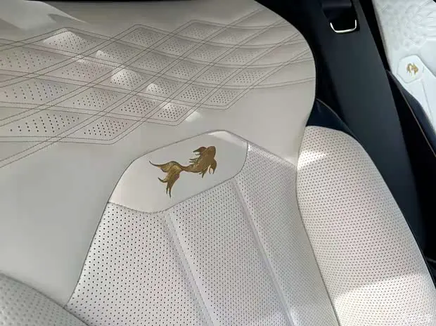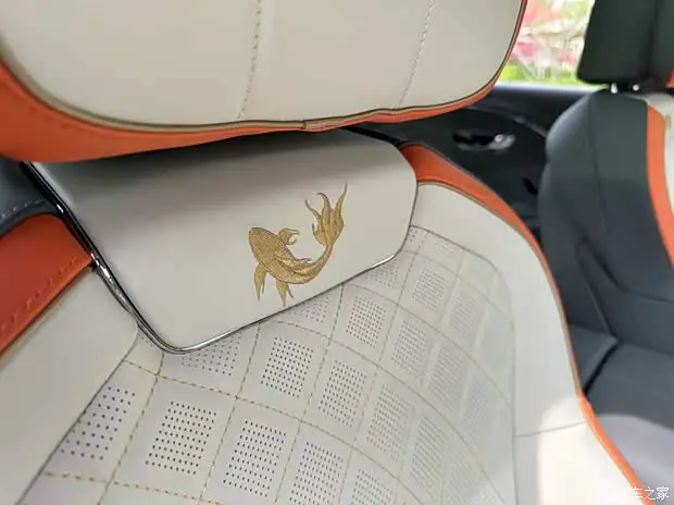 内饰来看,新车采用浅米色座椅,拥有橙色包边和金色菱形缝线,靠背拥有金色的锦鲤刺绣。车内门板处拥有锦鲤印花,副驾驶前方印有波浪线条纹理,使人联想起鲤鱼的鱼鳍和鱼尾。此外,门槛处也配备了锦鲤专属铭牌,内容与车外的铭牌保持一致。