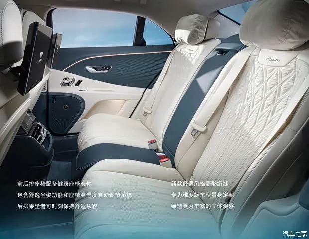 欧陆GT/GTC雅度版则会配备黑色格栅+直瀑式镀铬饰条装饰,翼子板处拥有专属标识,并会配备专属22英寸轮圈。车内则会采用新的3D钻石绗缝,座椅头枕上绣有Azure标识,另外欧陆GTC雅度版座椅还会配备颈部加热功能。