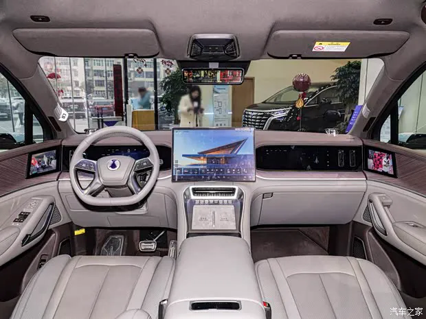 内饰采用三屏布局,中央的方形屏幕较大,两侧的屏幕融入中控台之中,中控台整体注重细节和材质的营造。新车采用2+2+2的座椅布局,后排提供液晶屏和小桌板。此外,新车还将会提供铂檀灰和云锦米两种内饰配色供选择。智驾部分,它搭载了天神之眼B-高阶智驾激光版(DiPilot 300),它属于比亚迪智系统的中间档,拥有端到端无图城市领航。硬件部分配备1颗高精度激光雷达,5颗覆盖前向、侧后向探测的毫米波雷达,12颗摄像头和12颗超声波雷达。智驾芯片为英伟达Orin X,算力254 TOPS。
