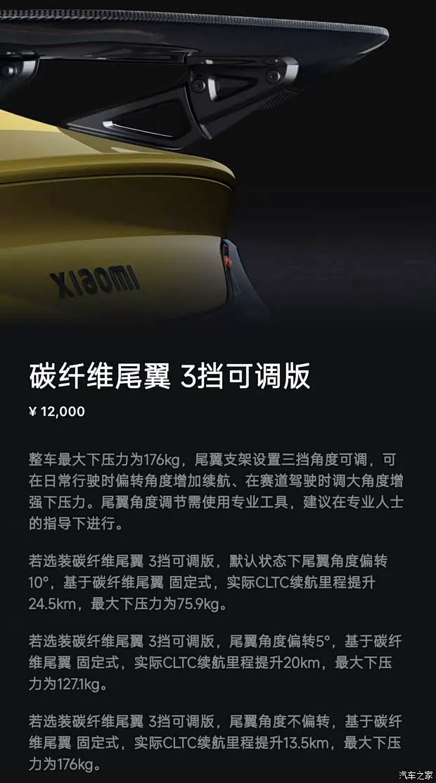 新的碳纤维后扰流板将提供最大下压力为176kg,支持三挡角度可调,默认状态下扰流板角度偏转10°,实际续航里程提升24.5km,最大下压力为75.9kg。角度偏转5°,实际续航里程提升20km,最大下压力为127.3kg。扰流板角度不偏转,实际续航里程可提升13.5km,最大下压力为176kg。