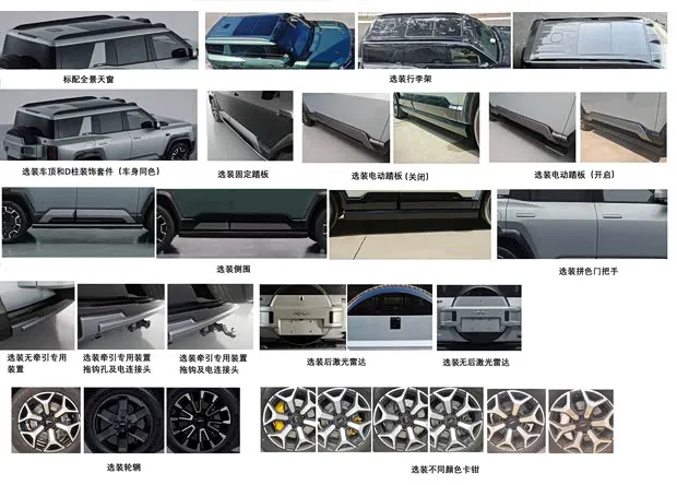 车身配件上,新车标配全景天窗、选装行李架、车顶和D柱装饰套件(车身同色)、固定踏板、电动踏板、牵引专用装置(包含拖钩孔及电连接头);新车还将配备后激光雷达、不同样式的轮圈可选、不同颜色卡钳可选。