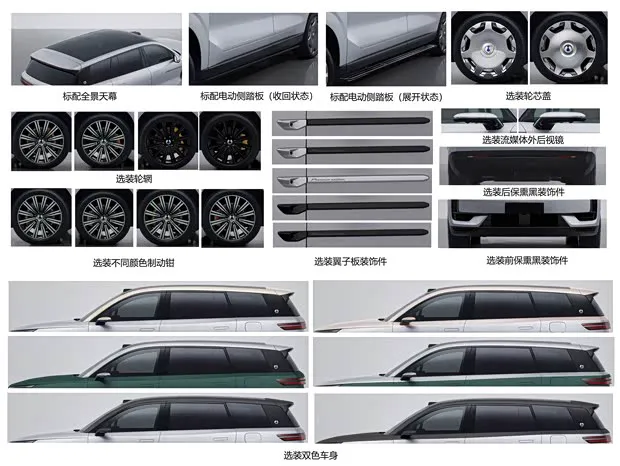 配置方面,新车标配全景天幕、电动侧踏板、可选装不同样式的轮毂盖和轮圈样式、不同颜色制动卡钳、翼子板装饰件、流媒体外后视镜、后保熏黑装饰件、前保熏黑装饰件、多种双色车身等。