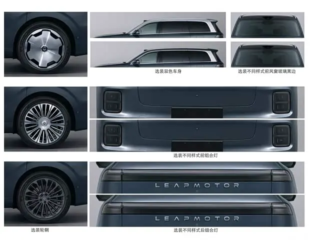 三电机版本车型车身尺寸长宽高分别为5252/1995/1780mm,轴距为3110mm,均配备21英寸轮圈。车身配件方面,该版本可选装不同样式的轮圈、双色车身、不同样式前组合灯、不同样式后组合灯、不同样式前风窗玻璃黑边等。