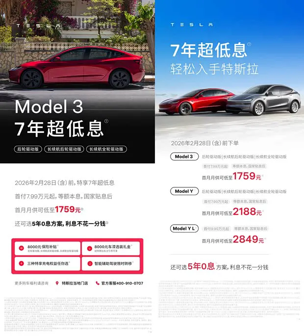 具体来看,2月28日前(含)下单可享7年低息金融方案,特斯拉Model 3后驱/长续后驱/长续全驱车型首付7.99万起,首月月供可低至1759元,并可选5年0息方案;同时,特斯拉Model Y后轮驱动/长续后轮驱动/长续全驱车型首月月供低至2188元。