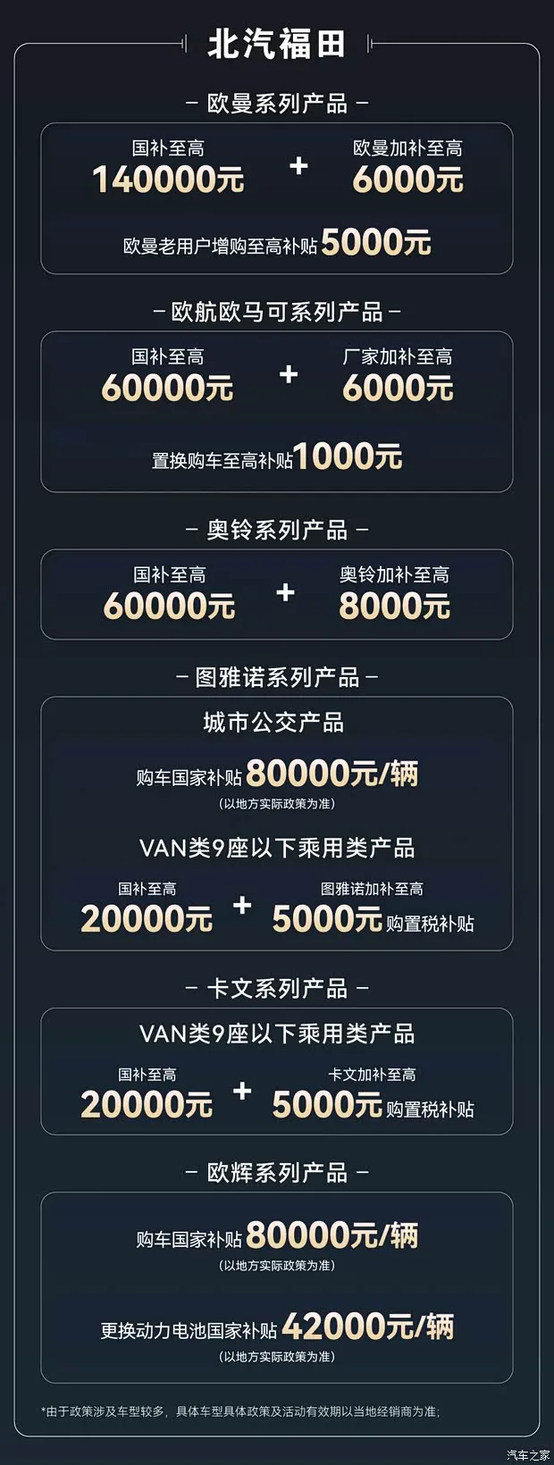 北汽福田品牌包含多款系列产品,其中欧曼系列至高可享140000元国补+至高6000元品牌补贴以及老用户增购至高5000元补贴;欧航欧马可系列至高可享至高60000元国补+至高6000元厂补以及置换补贴1000元等。关于该品牌更多信息,我们将持续关注。