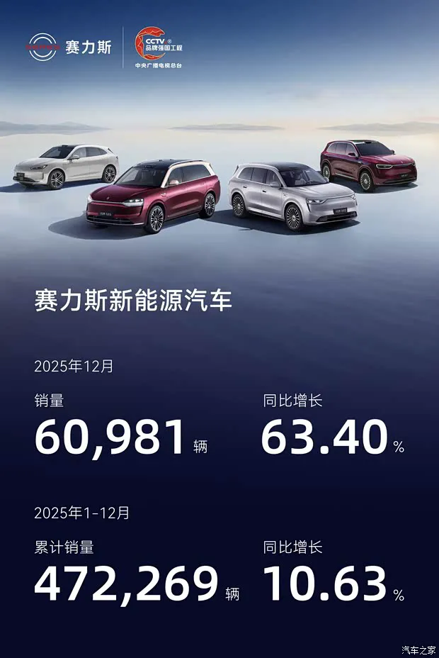 根据公开资料来看,2025年12月赛力斯新能源汽车销量60981辆,同比增长63.4%,首次突破6万辆大关;2025全年累计销量达472269辆,同比增长10.63%。