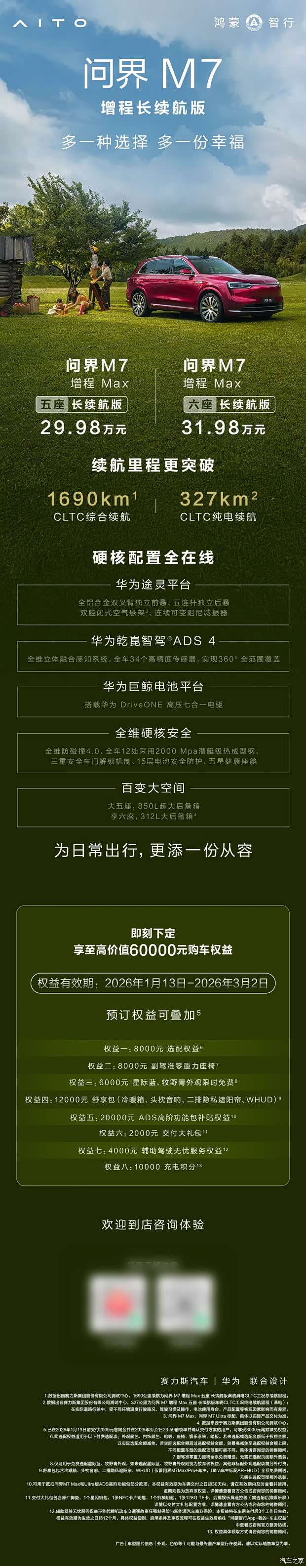 1月13日,问界M7(参数|询价)增程长续航版上市,新车共推出两款车型,售价分别为29.98万元和31.98万元。新车CLTC纯电续航里程提升至327km,CLTC综合续航里程提升至1690km。截止至3月2日前下定可享至高价值60000元权益,包括8000元选配权益、8000元副驾准零重力座椅、6000元外观颜色选配、12000元舒适包、20000元ADS高阶功能包补贴、2000元交付礼包、4000元辅助驾驶无忧服务和10000充电积分。 问界M7增程长续航版 指导价格 车型 售价(万元) 五座长续航版 29.98 六座长续航版 31.98