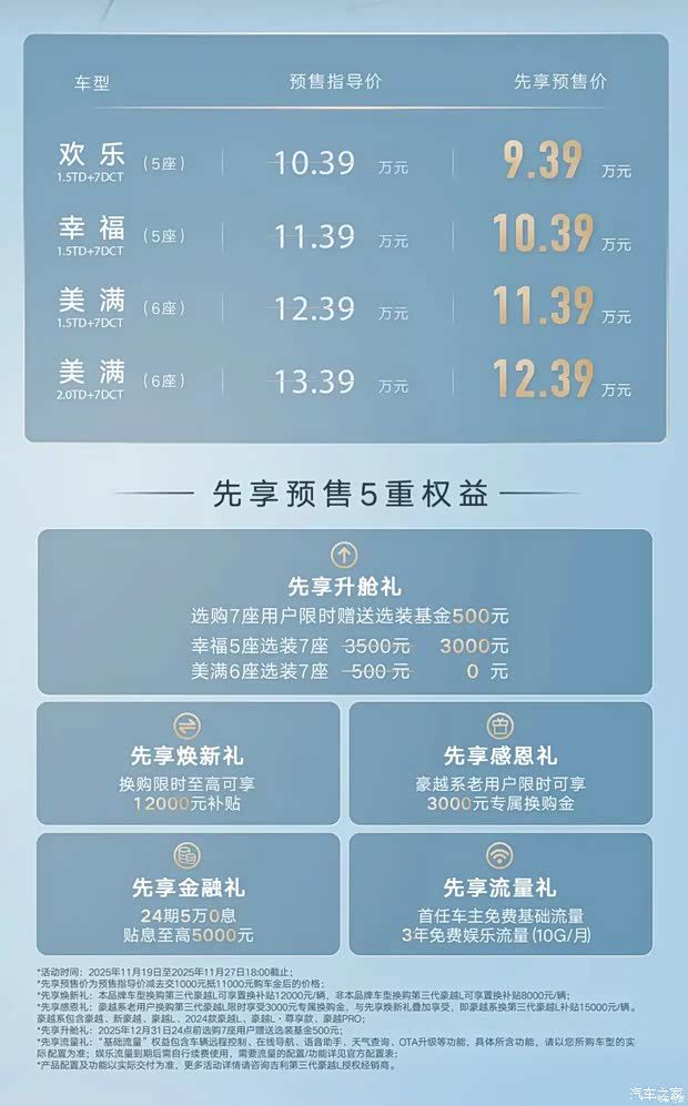 日前,我们从官方获悉,新款豪越L(参数|询价)将于11月27日正式上市,新车在11月22日已经开启预售,共推出四款配置,预售指导价区间为10.39-13.39万元,先享预售价区间为9.39-12.39万元。新车针对外观、内饰和动力系统均有升级,将会搭载Flyme Auto智能座舱系统并动力,车内提供5/6/7座三种座椅布局。