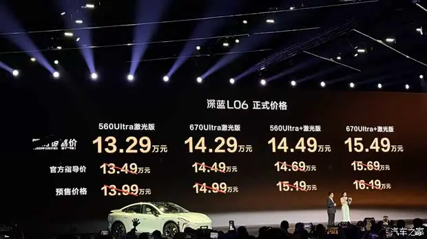 深蓝L06 官方售价 车型 官方指导价(万元) 限时惊喜价(万元) 560Ultra激光版 13.49 13.29 670Ultra激光版 14.49 14.29 560Ultra+激光版 14.69 14.49 670Ultra+激光版 15.69 15.49