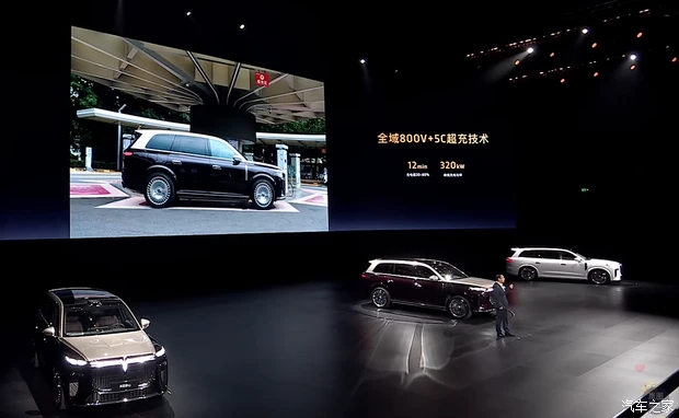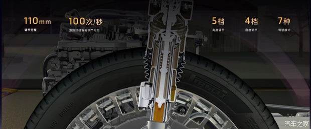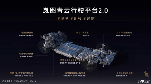 动力方面,新车搭载1.5T发动机+双电机四驱组成的插混动力系统(岚海智能超混),发动机最大功率110千瓦,配备来自宁德时代和蜂巢能源的63kWh三元锂电池组,CLTC纯电续航370km,CLTC综合续航1400km,提供800V高压平台+5C超快充,20%-80%充电时间仅需12分钟。此外,还首发搭载了三腔空气悬架+EDC魔毯功能,双向16°后轮独立转向。竞争对手