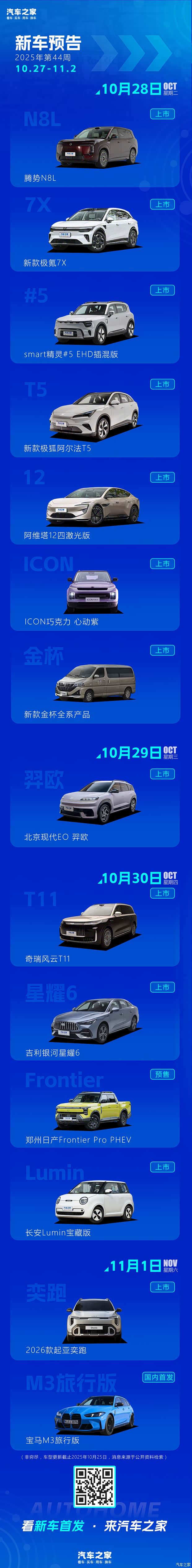 咱们今天的目光聚焦在 10 月 27 日到 11 月 2 日这一周。这段时间可以说是车市里的“高能时刻”,多款重磅新车接连登场,无论是上市、预售还是首发,每一款都看点十足。这不仅是各大品牌冲刺年底销量的关键动作,更是技术实力与产品力的一次集中展示。