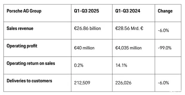 首先,咱们得直面这几个关键数字,它们直接反映了保时捷当前的经营状况。根据第三季度财报显示,2025 年前三季度的表现如下: