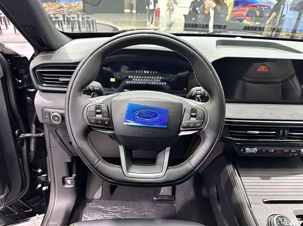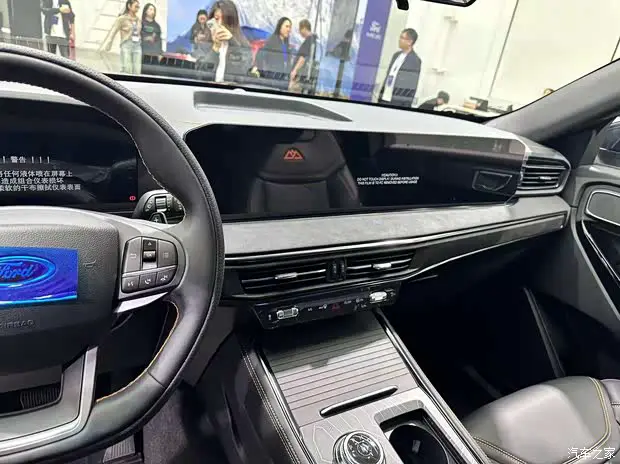 坐进车内,最吸睛的莫过于眼前的屏幕组合。新车采用了12.3 英寸全液晶仪表搭配 27 英寸 4K 中控连屏的设计,这种超宽屏方案不仅极大地拉伸了横向视觉宽度,更带来了沉浸式的交互体验。车机内置了SYNC+3.0 智行互联系统,操作流畅度和功能丰富性都达到了主流水准。方向盘延续了经典的三辐式多功能设计,握感扎实,按键布局也符合人体工程学。