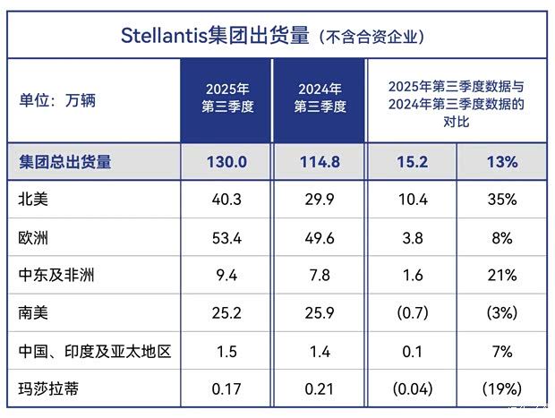 北美区销量的提升,是集团全球销量增长的主要因素。 这块市场可以说是 Stellantis 的“粮仓”,表现稳健直接拉动了大盘,显示出其在传统优势领域的统治力依然稳固。