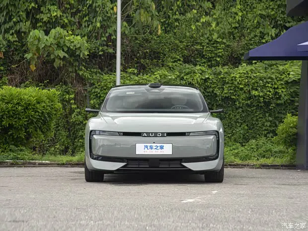 走到车头面前,你会发现它采用了封闭式中网设计,这可是电动车或者智能车的典型特征,能有效降低风阻。搭配环绕式的点阵式 LED 日间行车灯带,视觉效果非常犀利。最吸睛的是那个可发光的"AUDI"标识,一亮起来,未来的氛围感直接拉满,同时也强化了品牌的科技属性。