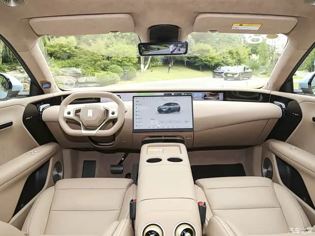 当你坐进车内,第一感觉就是这套内饰设计虽然没能迎来翻天覆地的变化,但放在今天来看,颜值依旧在线,完全经得起时间的考验。特别是在配色方面,这次新增了“岩棕”可选,为用户提供了更多个性化的选择。放眼望去,远端那块 35.4 英寸的狭长 4K 屏,搭配 15.6 英寸的中控屏,视觉冲击力很强。再加上大面积皮革包裹以及氛围灯的烘托,整个座舱营造出的档次感和科技感相当充足,不会让人觉得过时。