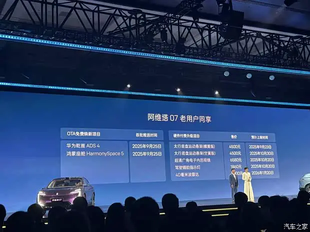 对于已经提车的老车主,官方也没有忘记。官方明确表态,从9 月 25 日起,将陆续向阿维塔 07 老车主推送OTA 升级。这说明新款的部分核心体验,老款用户也能通过软件升级享受到,这点确实挺厚道。