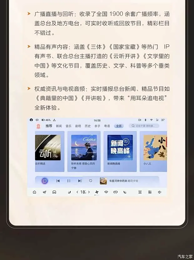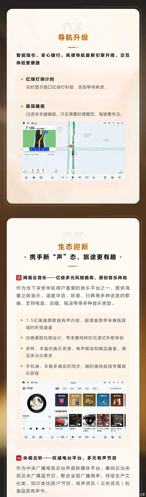 第五,生态应用迎新。车机不再是一座孤岛,更多生态应用的接入丰富了车内娱乐和生活服务,让长途穿越也不再枯燥,车内生活更加多彩。