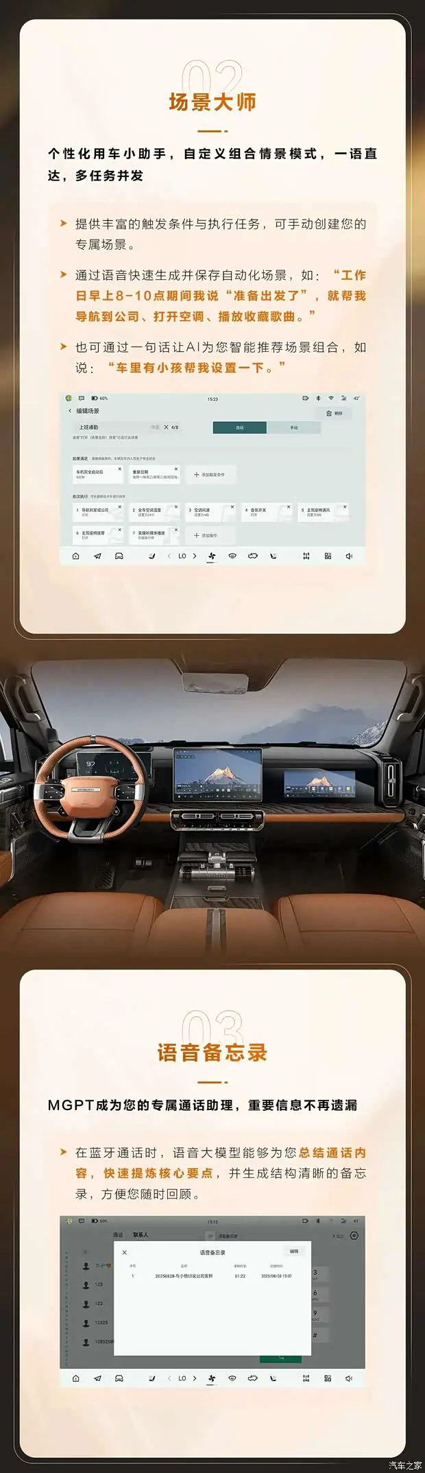 对于商务人士来说,这个功能绝对实用。MGPT 现在能成为你的通话助理。当你通过蓝牙通话时,语音大模型会在后台实时总结通话内容,提炼要点,通话结束后自动生成备忘录。再也不用一边开车一边手忙脚乱地找笔记录,既保证了驾驶安全,又不错过任何关键信息。