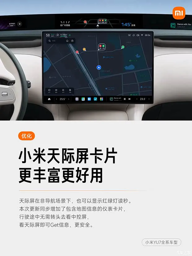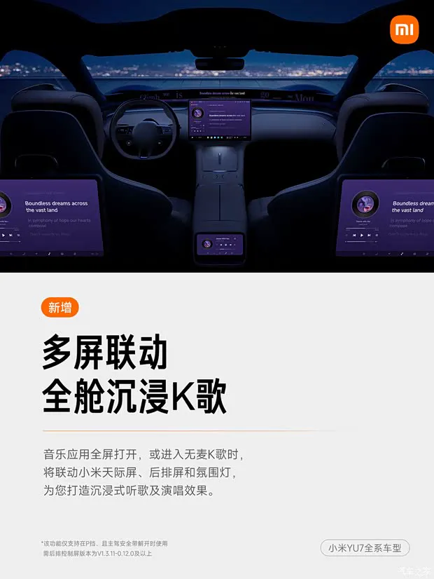 对于喜欢记录生活和热爱娱乐的用户,这次更新同样惊喜满满。行车记录功能得到增强,全新相机 Beta 版上线,支持在行车过程中记录美好生活瞬间。同时,全舱沉浸 K 歌功能正式解锁,联动小米天际屏、后排屏以及氛围灯,将 KTV 体验融入座舱空间,全家出行乐趣倍增。