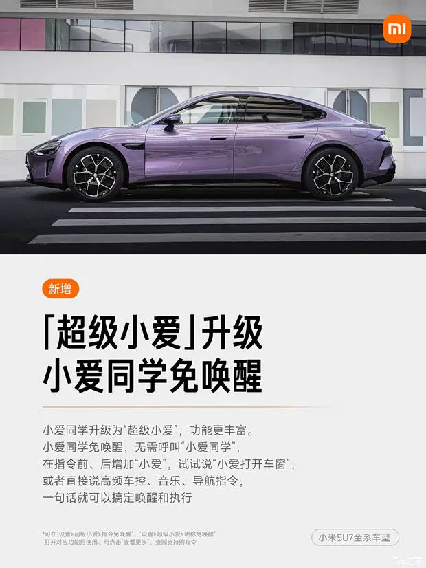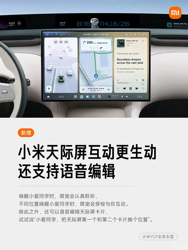 小米YU7超级小爱新增语音播报音色,可选自然甜美女声“柚子” ;新增小米天际屏语音互动、编辑,唤醒小爱时萌宠聆听、穿梭等动态交互,语音也可编辑小米天际屏卡片;优化多模态问答体验,新增“问建筑”,可询问车辆多方位建筑,支持对颜色、高度等询问,也支持在结果图片上圈选目标继续识别;优化车外语音体验,支持更多问答、功能控制等,如开启露营、打开哨兵、车外拍照、后排座椅放倒等;优化小爱打招呼体验,增加引导弹窗,打招呼内容包含更多实用性信息。